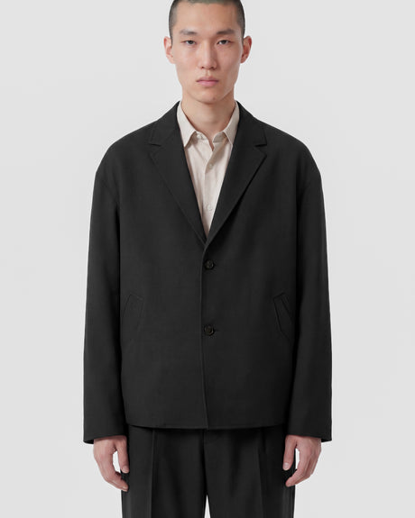 Crafted with French precision, this black blazer features tropical cold wool construction designed for exceptional longevity. The breathable material delivers year-round comfort, complemented by signature front and interior pockets for everyday practicality. Drop shoulders and gently curved sleeves establish a modern silhouette, secured by an elegant two-button closure.