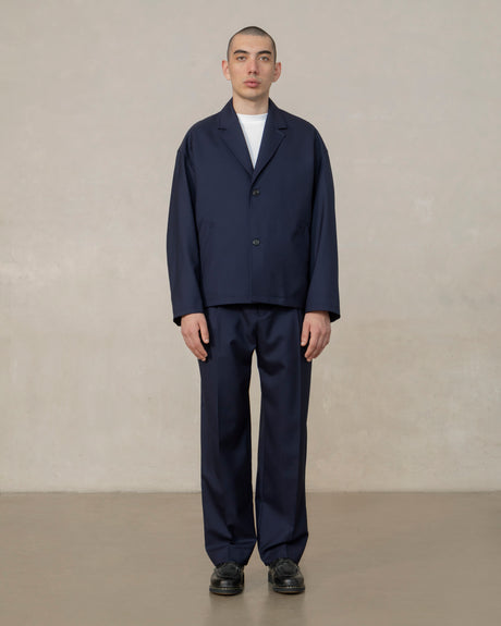 Stylish and functional, this navy blazer is made with cold wool for a relaxed look and lasting wear. Developed and crafted in France, its breathable fabric ensures comfort in any season. Signature incrusted pockets on the front and inside pocket provide easy access storage, while the two buttons and drop shoulders give it a timeless style. Rounded sleeves complete the look.