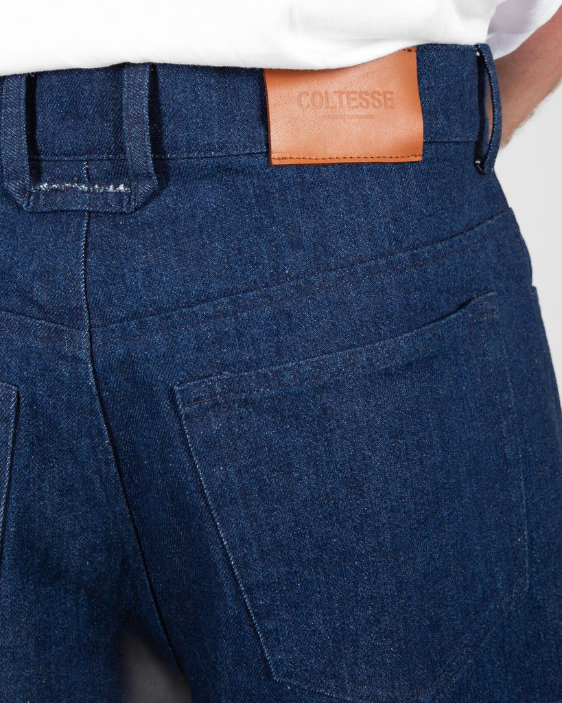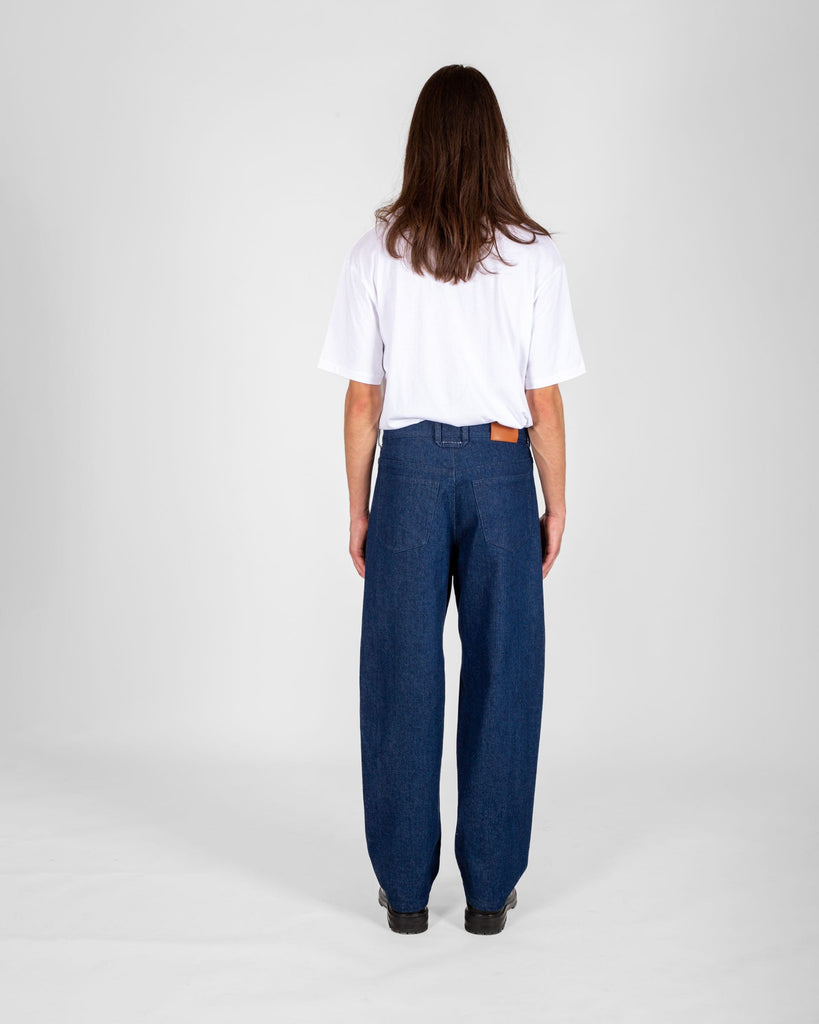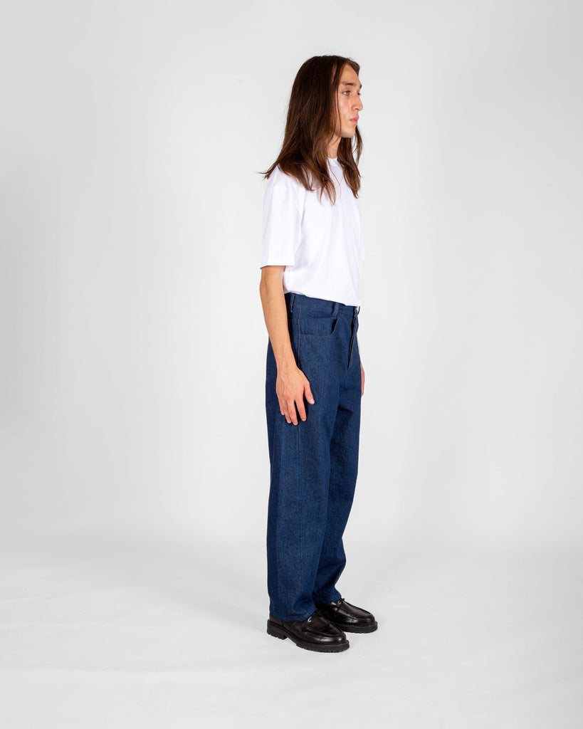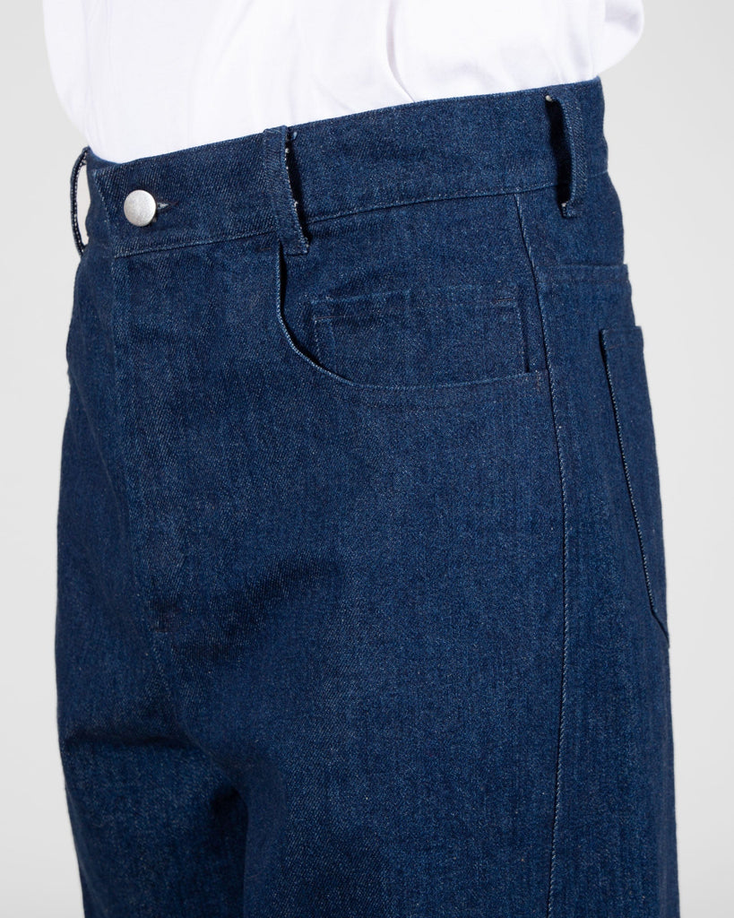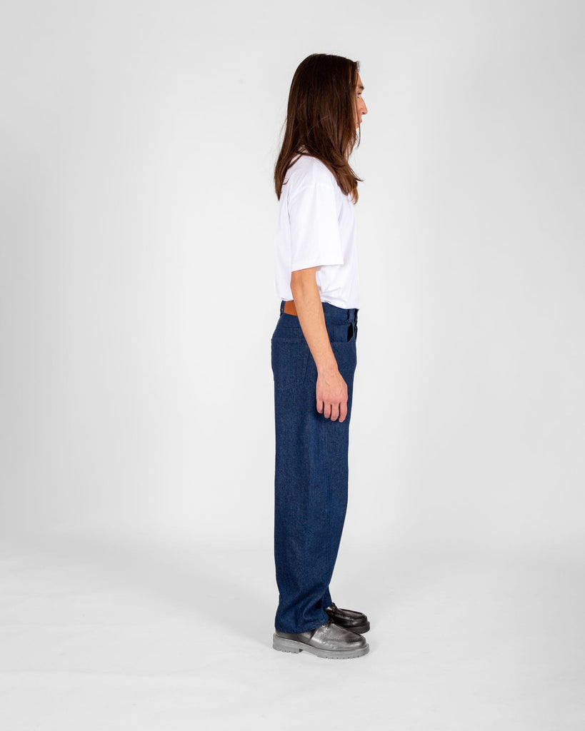 Cotton denim pants, slightly curved leg and side seam twisted, made in Spanish denim and equipped with five pockets: two front western pockets, one coin pocket, two back patch pockets. Other details: flat belt with loop, button fly, branded leather patch.
