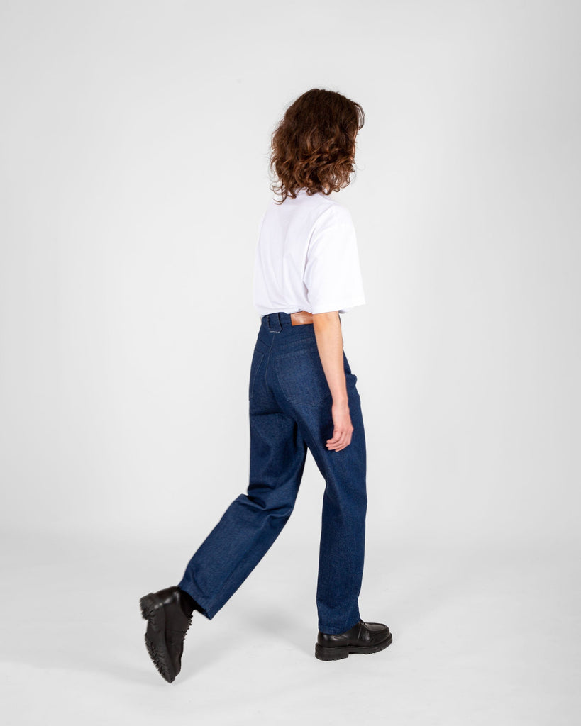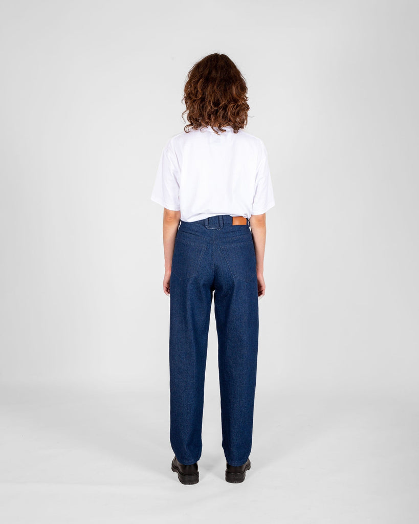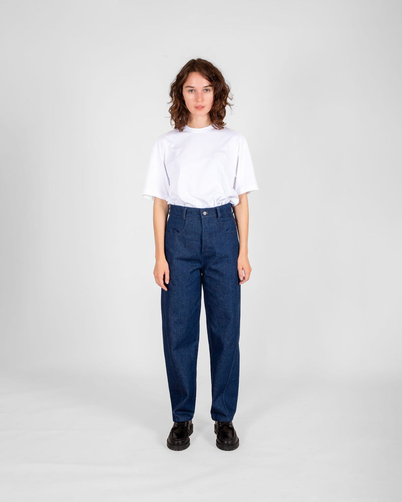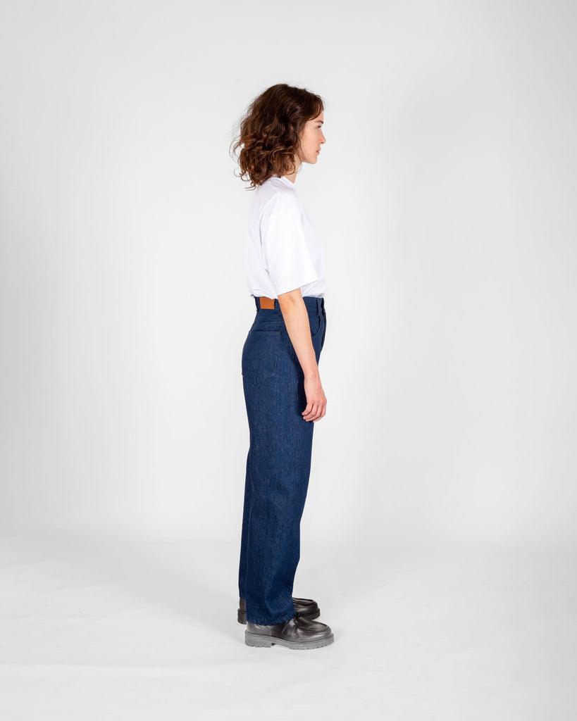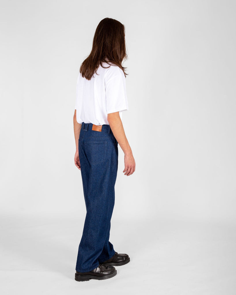 Cotton denim pants, slightly curved leg and side seam twisted, made in Spanish denim and equipped with five pockets: two front western pockets, one coin pocket, two back patch pockets. Other details: flat belt with loop, button fly, branded leather patch.