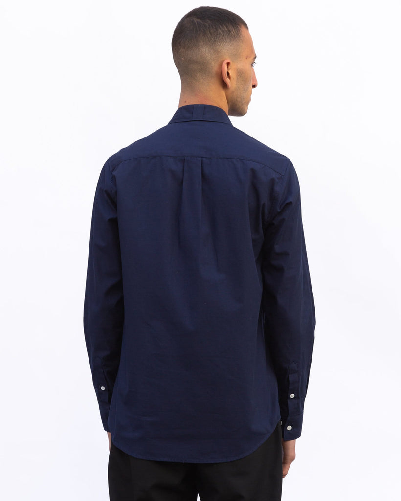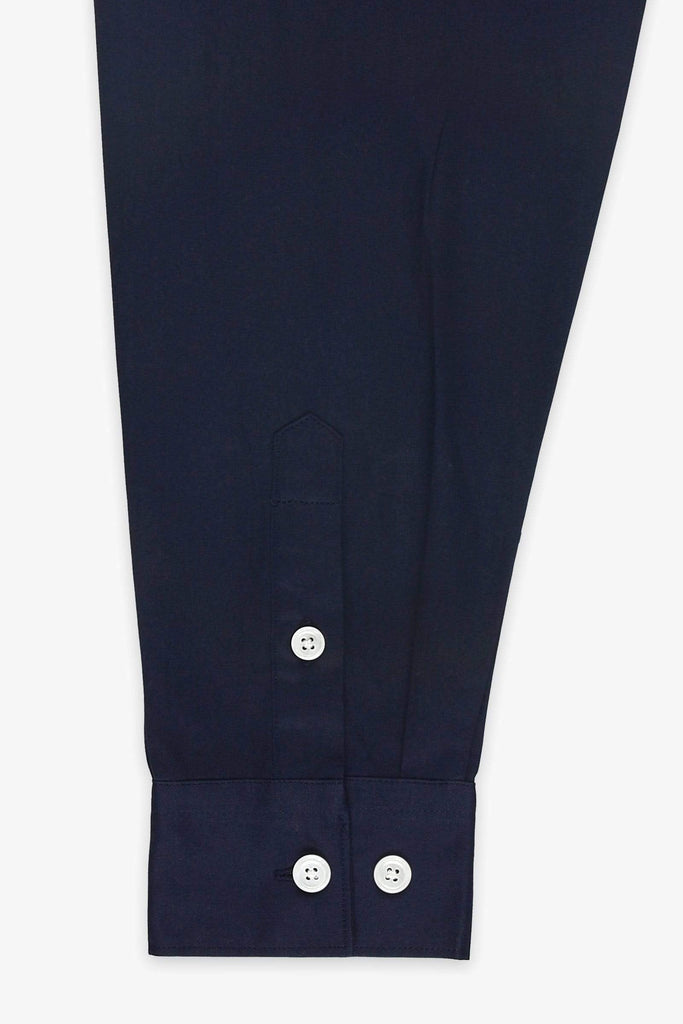 Classic fitted shirt with mother of pearl buttons and crafted from a navy cotton poplin.